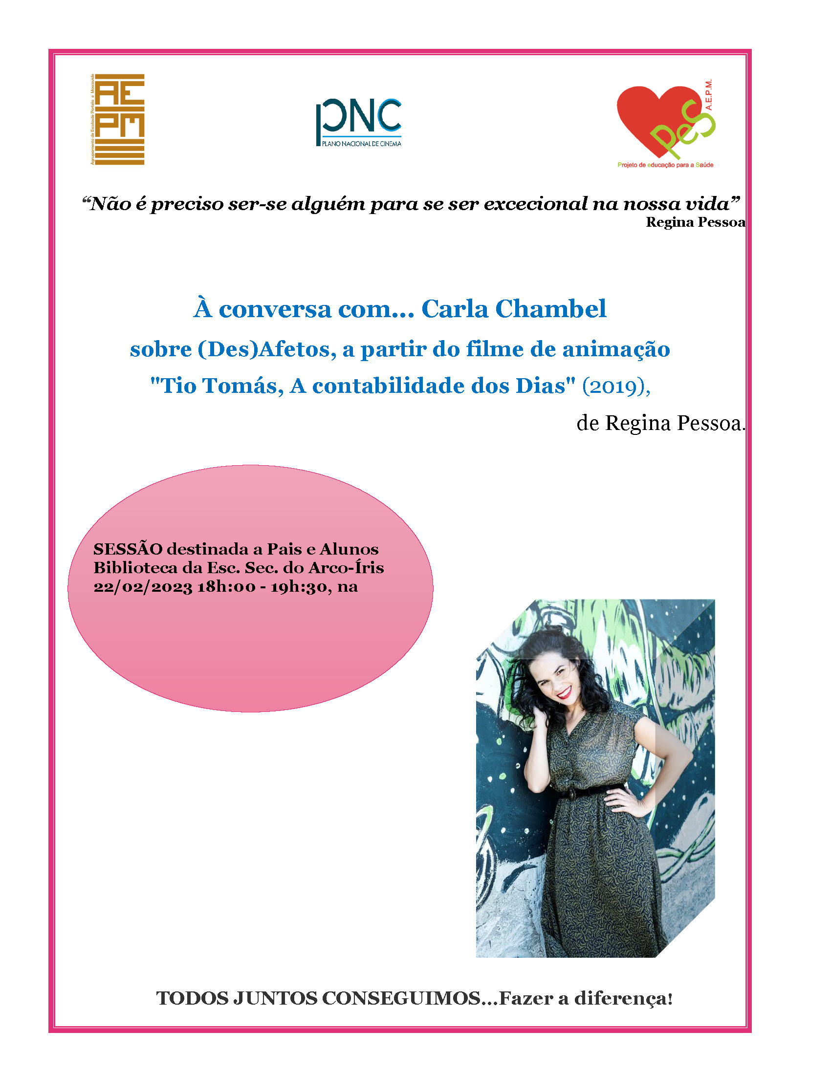 No passado dia 22 de fevereiro de 2023, pelas 18h:00, alunos, pais e professores estiveram “À conversa com… a atriz Carla Chambel sobre (Des)Afetos”, a partir do filme de animação Tio Tomás, A Contabilidade dos Dias (2019), de Regina Pessoa, numa sessão organizada pelas equipas do PES (Projeto de Educação para a Saúde) e do PNC (Plano Nacional de Cinema).